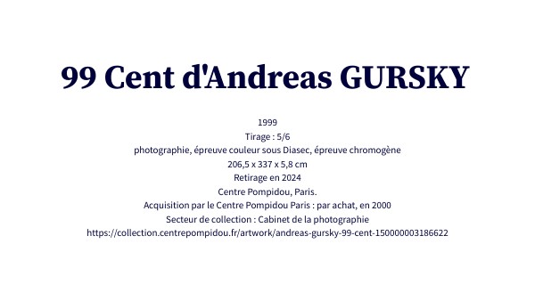 1999 Tirage : 5/6 photographie, épreuve couleur sous Diasec, épreuve chromogène 206,5 x 337 x 5,8 cm Retirage en 2024 Centre Pompidou, Paris. Acquisition par le Centre Pompidou Paris : par achat, en 2000 Secteur de collection : Cabinet de la photographie https://collection.centrepompidou.fr/artwork/andreas-gursky-99-cent-150000003186622