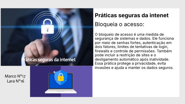 O bloqueio de acesso é uma medida de segurança de sistemas e dados. Ele funciona por meio de senhas fortes, autenticação em dois fatores, limites de tentativas de login, firewalls e controle de permissões. Também pode incluir a restrição de sites e o desligamento automático após inatividade. Essa prática protege a privacidade, evita invasões e ajuda a manter os dados seguros.