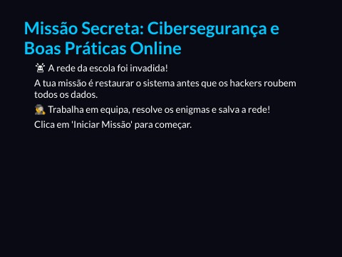 🚨 A rede da escola foi invadida! A tua missão é restaurar o sistema antes que os hackers roubem todos os dados. 🕵️♂️ Trabalha em equipa, resolve os enigmas e salva a rede! Clica em 'Iniciar Missão' para começar.