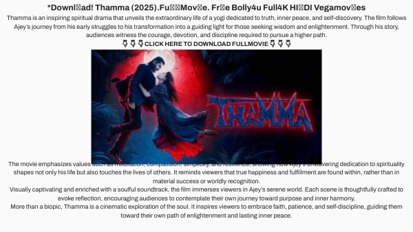Thamma is an inspiring spiritual drama that unveils the extraordinary life of a yogi dedicated to truth, inner peace, and self-discovery. The film follows Ajeyās journey from his early struggles to his transformation into a guiding light for those seeking wisdom and enlightenment. Through his story, audiences witness the courage, devotion, and discipline required to pursue a higher path. šššCLICK HERE TO DOWNLOAD FULLMOVIEššš The movie emphasizes values such as meditation, compassion, simplicity, and resilience, showing how Ajeyās unwavering dedication to spirituality shapes not only his life but also touches the lives of others. It reminds viewers that true happiness and fulfillment are found within, rather than in material success or worldly recognition. Visually captivating and enriched with a soulful soundtrack, the film immerses viewers in Ajeyās serene world. Each scene is thoughtfully crafted to evoke reflection, encouraging audiences to contemplate their own journey toward purpose and inner harmony. More than a biopic, Thamma is a cinematic exploration of the soul. It inspires viewers to embrace faith, patience, and self-discipline, guiding them toward their own path of enlightenment and lasting inner peace.