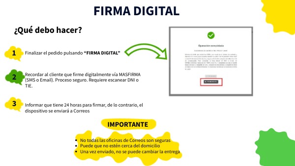 Recordar al cliente que firme digitalmente vía MASFIRMA (SMS o Email). Proceso seguro. Requiere escanear DNI o TIE.