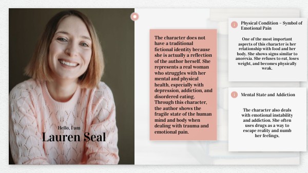 The character does not have a traditional fictional identity because she is actually a reflection of the author herself. She represents a real woman who struggles with her mental and physical health, especially with depression, addiction, and disordered eating. Through this character, the author shows the fragile state of the human mind and body when dealing with trauma and emotional pain.
