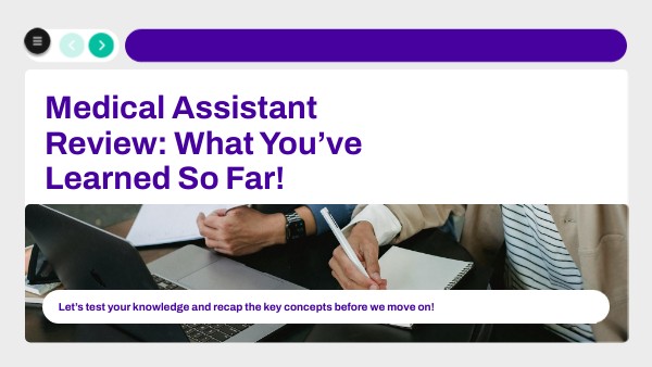 You’ve reviewed everything from your role as a Medical Assistant to medical terminology, health records, and the body’s major systems. Each topic builds your confidence and prepares you to apply what you’ve learned in real healthcare settings. Keep up the amazing work — your dedication is what makes you stand out! ✨ Next Up: Get ready to dive into your next module and continue building your hands-on medical knowledge.