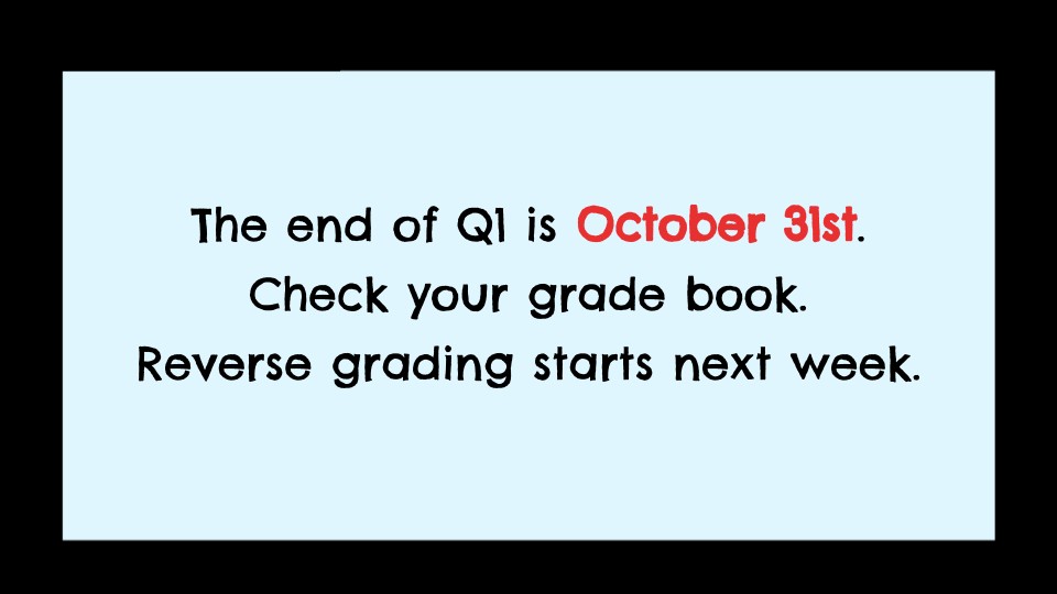 The end of Q1 is October 31st. Check your grade book. Reverse grading starts next week.