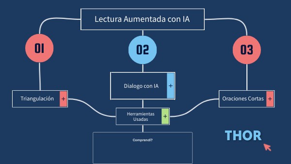 THOR representa mi proceso de lectura aumentada con IA. Cada letra simboliza una fase de mi ritmo lector: T – Triangulación: Comienzo conectando lo que ya sé con lo que el texto propone y lo que pienso al final. Me ayuda a construir sentido desde distintas perspectivas. H – Hablar con la IA: Mantengo una conversación activa con la inteligencia artificial para aclarar dudas, analizar ideas y profundizar la comprensión. O – Oraciones cortas: Sintetizo lo aprendido en frases simples, claras y significativas, para fijar la comprensión. R – Reflexión: Cierro la lectura transformando lo aprendido en una interpretación personal y consciente.