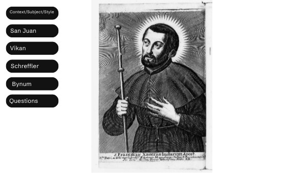 Vikan positions the Byzantine icon as one in a perpetual state of “copy.” Byzantines believed that “power and sanctity” resided in all icons—-regardless of their medium, style, expense, etc. (50) A qualitative hierarchy was not imposed among icons during this period; therefore there was no distinguishable difference between copy and original. (50, 51) The icon’s aim was to capture the likeness of the deity or saint—linking its purpose to that of the votive print tradition of Naples during the Plague of 1656. It is in this way we can come to think about the lineage of Saint Francis Xavier imagery as copie building upon the true original: the material body of the saint and his use of the most holy wood of the cross in order to cure Mastrilli.