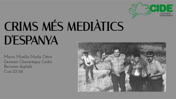 El meu tema de recerca són els crims més mediàtics d'Espanya, com per exemple el cas Alcàsser. He triat aquest tema ja que des de fa temps m'estic interessant en documentals i pòdcast de crims, i m'agradaria que la gent també els conegués i que veiessin el meu punt de vista sobre això.
