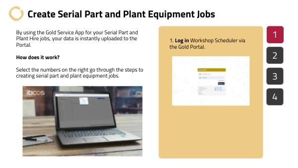 By using the Gold Service App for your Serial Part and Plant Hire jobs, your data is instantly uploaded to the Portal. How does it work? Select the numbers on the right go through the steps to creating serial part and plant equipment jobs.