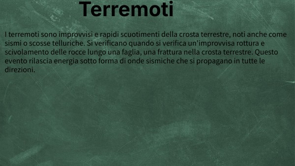 I terremoti sono improvvisi e rapidi scuotimenti della crosta terrestre, noti anche come sismi o scosse telluriche. Si verificano quando si verifica un'improvvisa rottura e scivolamento delle rocce lungo una faglia, una frattura nella crosta terrestre. Questo evento rilascia energia sotto forma di onde sismiche che si propagano in tutte le direzioni.