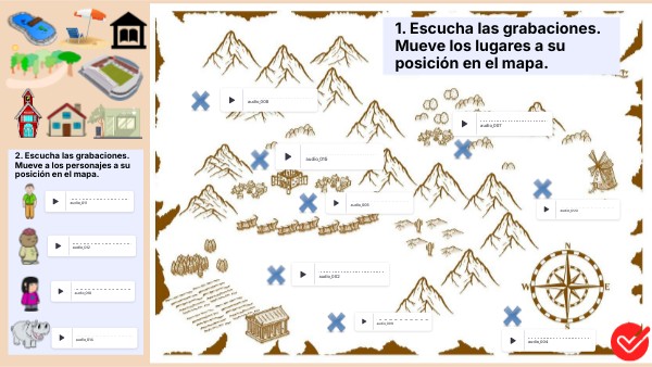 2. Escucha las grabaciones. Mueve a los personajes a su posición en el mapa.