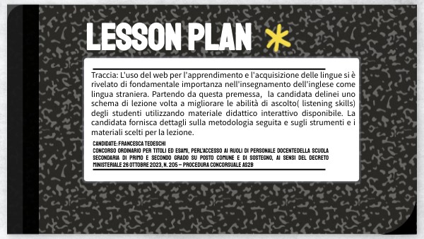 Traccia: L'uso del web per l'apprendimento e l'acquisizione delle lingue si è rivelato di fondamentale importanza nell'insegnamento dell'inglese come lingua straniera. Partendo da questa premessa, la candidata delinei uno schema di lezione volta a migliorare le abilità di ascolto( listening skills) degli studenti utilizzando materiale didattico interattivo disponibile. La candidata fornisca dettagli sulla metodologia seguita e sugli strumenti e i materiali scelti per la lezione.