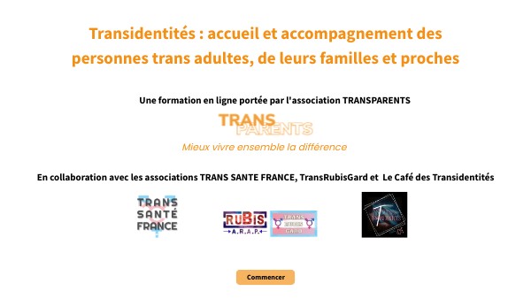 Cette formation - qui s’appuie sur le cadre et les pratiques en vigueur en France - est organisée en quatre parties. Selon vos besoins, vous pouvez : approfondir vos connaissances sur les transidentités, notamment le vocabulaire lié à l'identité de genre, plonger dans le quotidien d'une personne trans et vous confronter à ses difficultés, découvrir les spécificités de la prise en charge médicale des transidentités, ou passer directement aux mises en situation et faire émerger des bonnes pratiques professionnelles. Une fiche reprenant les savoirs indispensables et ces bonnes pratiques, avec des ressources complémentaires, pourra être téléchargée à l'issue de la partie "Mises en situation". Vous pouvez également consulter la dernière recommandation de la HAS.