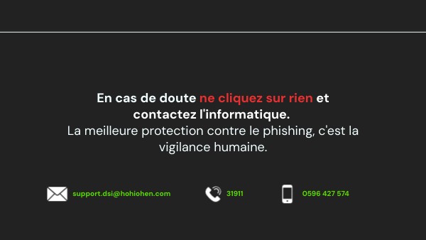 En cas de doute ne cliquez sur rien et contactez l'informatique. La meilleure protection contre le phishing, c'est la vigilance humaine.