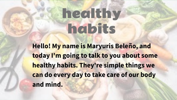 Hello! My name is Maryuris Beleño, and today I'm going to talk to you about some healthy habits. They're simple things we can do every day to take care of our body and mind.
