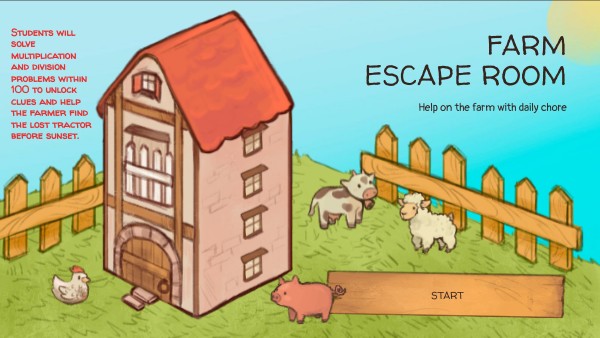 Welcome to Green Valley Farm! Farmer jill Needs help to complete her daily farm chores to get out of the barn, and the animals are starting to become impatient! You must solve multiplication and division puzzles to collect the keys that will unlock the barn to get out!