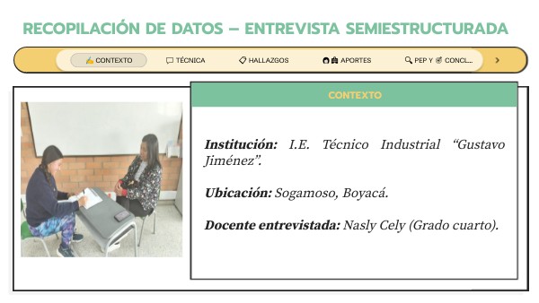 Institución: I.E. Técnico Industrial “Gustavo Jiménez”. Ubicación: Sogamoso, Boyacá. Docente entrevistada: Nasly Cely (Grado cuarto).