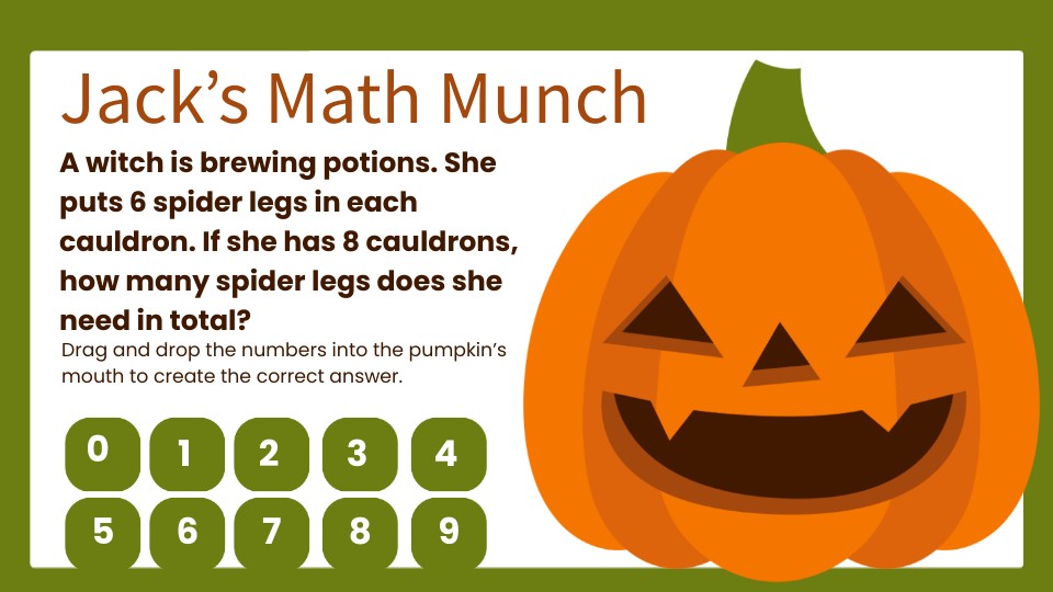 Drag and drop the numbers into the pumpkin’s mouth to create the correct answer.