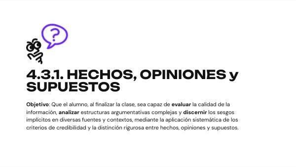 Objetivo: Que el alumno, al finalizar la clase, sea capaz de evaluar la calidad de la información, analizar estructuras argumentativas complejas y discernir los sesgos implícitos en diversas fuentes y contextos, mediante la aplicación sistemática de los criterios de credibilidad y la distinción rigurosa entre hechos, opiniones y supuestos.
