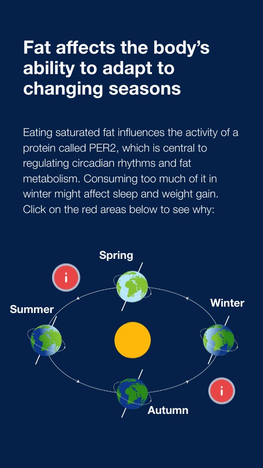 Eating saturated fat influences the activity of a protein called PER2, which is central to regulating circadian rhythms and fat metabolism. Consuming too much of it in winter might affect sleep and weight gain. Click on the red areas below to see why:
