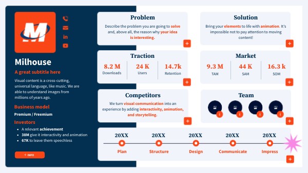 With Genially templates, you can include visual resources to leave your audience amazed. Also, highlight a phrase or specific piece of data that will be burned into the memory of your audience, or even embed external content that surprises: videos, photos, audios... Whatever you want! Do you need more reasons to create dynamic content? Well: 90% of the information we assimilate comes through sight, and we also retain 42% more information when the content moves.