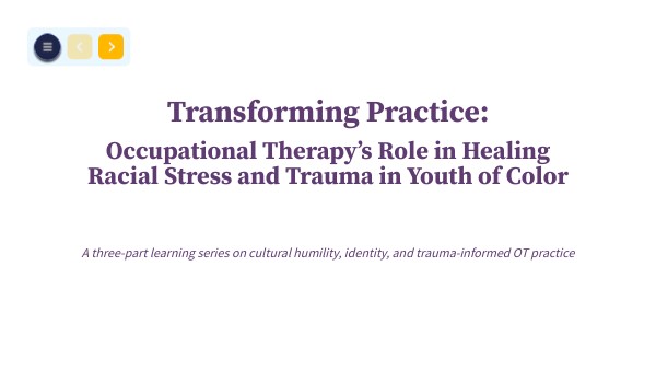 These modules were created as part of a Doctoral Capstone Project in response to the growing need for culturally responsive, justice-informed OT practices that center the lived experiences of youth of color. While much has been done to advance trauma-informed care in occupational therapy, a gap remains in addressing the intersections of racial trauma and occupational participation. These modules aim to bridge that gap by offering a deeper understanding of racial stress and trauma (RST), cultural humility, and occupation-based interventions that support healing, resilience, and empowerment.