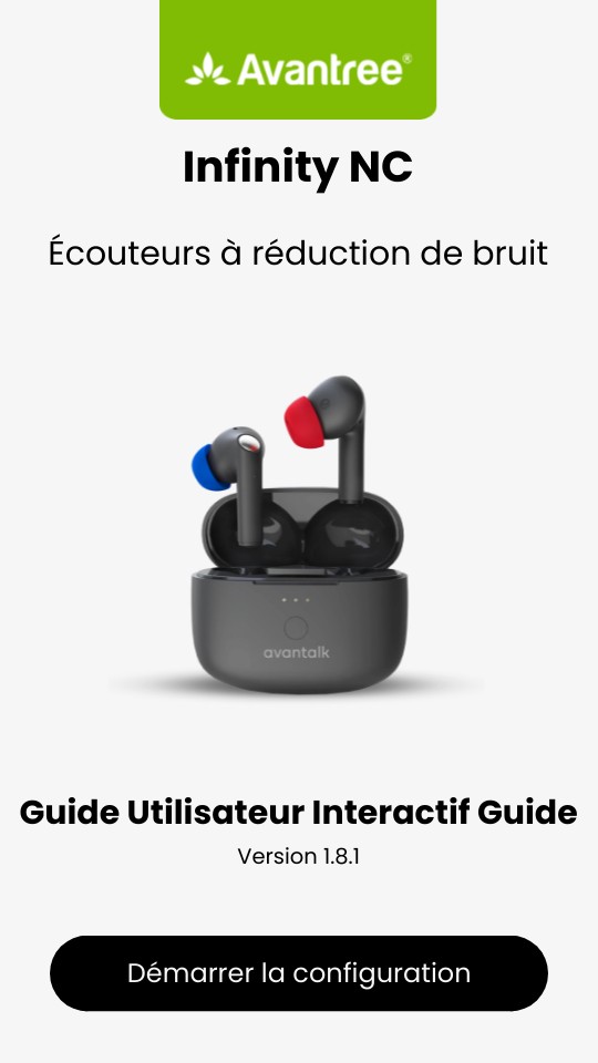Sur votre appareil Bluetooth (comme le téléphone), activez le Bluetooth et sélectionnez "Avantalk Infinity NC". Connecté : la LED devient bleu fixe pendant 1s, puis s'éteint.