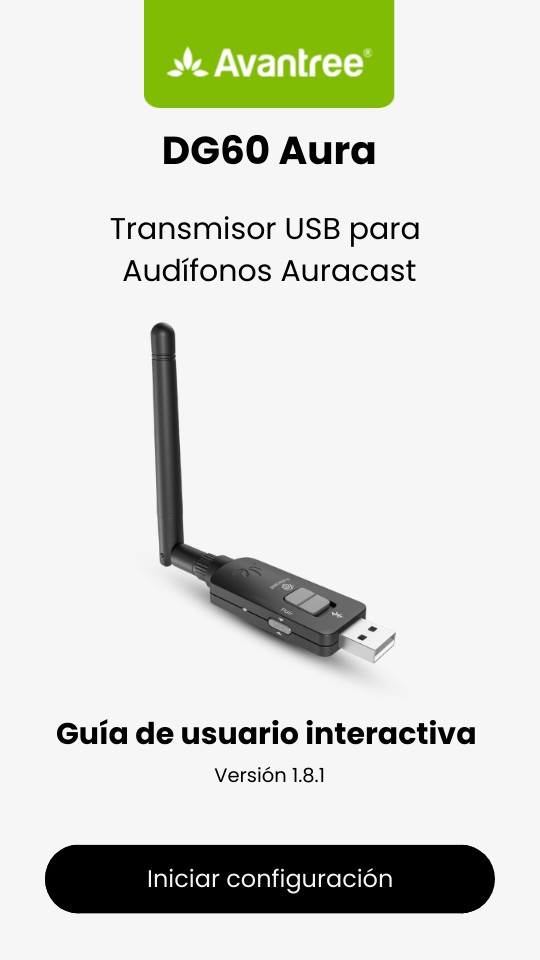 DG60 Aura es un transmisor de audio USB. Admite Bluetooth y Auracast™ transmisión inalámbrica.