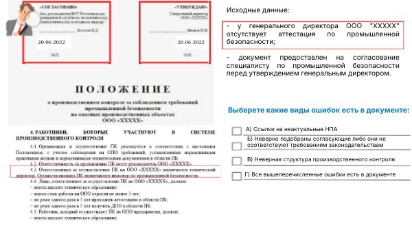 Исходные данные: - у генерального директора ООО "ХХХХХ" отсутствует аттестация по промышленной безопасности; - документ предоставлен на согласование специалисту по промышленной безопасности перед утверждением генеральным директором.