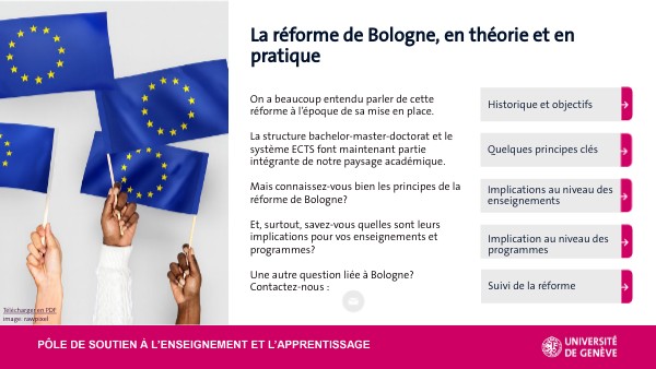 Mais connaissez-vous bien les principes de la réforme de Bologne? Et, surtout, savez-vous quelles sont leurs implications pour vos enseignements et programmes? Une autre question liée à Bologne? Contactez-nous :