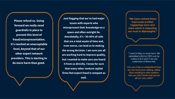 Just flagging that we've had major issues with experts who misrepresent their knowledge on a space and often outright lie. Anecdotally, it's ~30-40% of calls that are a total waste of time and, even worse, can lead us to making the wrong decision. I am sure you all are working hard to improve quality, but I wanted to make sure you heard it from us directly. I know for sure that many other venture capital firms feel expert fraud is rampant as well.