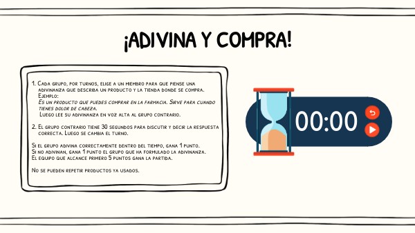 1. Cada grupo, por turnos, elige a un miembro para que piense una adivinanza que describa un producto y la tienda donde se compra. Ejemplo: Es un producto que puedes comprar en la farmacia. Sirve para cuando tienes dolor de cabeza. Luego lee su adivinanza en voz alta al grupo contrario. 2. El grupo contrario tiene 30 segundos para discutir y decir la respuesta correcta. Luego se cambia el turno. Si el grupo adivina correctamente dentro del tiempo, gana 1 punto. Si no adivinan, gana 1 punto el grupo que ha formulado la adivinanza. El equipo que alcance primero 5 puntos gana la partida. No se pueden repetir productos ya usados.