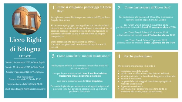 Sabato 15 novembre 2025 in Viale Pepoli Sabato 20 dicembre 2025 in Viale Pepoli Sabato 17 gennaio 2026 in Via Tolmino Due fasce orarie Primo turno: dalle 15:00 alle 16:30 Secondo turno: dalle 16:30 alle 18:00 email: openday.righi@righibo.istruzioneer.it
