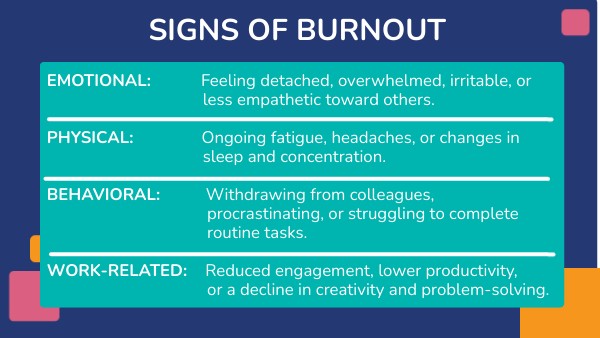 EMOTIONAL: Feeling detached, overwhelmed, irritable, or less empathetic toward others. PHYSICAL: Ongoing fatigue, headaches, or changes in sleep and concentration. BEHAVIORAL: Withdrawing from colleagues, procrastinating, or struggling to complete routine tasks. WORK-RELATED: Reduced engagement, lower productivity, or a decline in creativity and problem-solving.