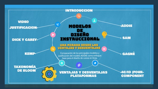 Modelo sistemático que considera el aprendizaje como un proceso interrelacionado. Incluye fases de análisis de metas, desarrollo de objetivos, diseño de estrategias, elaboración de materiales, evaluación formativa y sumativa.