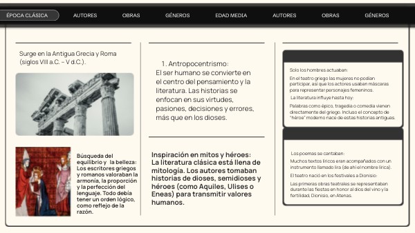 El ser humano se convierte en el centro del pensamiento y la literatura. Las historias se enfocan en sus virtudes, pasiones, decisiones y errores, más que en los dioses.Solo los hombres actuaban: En el teatro griego las mujeres no podían participar, así que los actores usaban máscaras para representar personajes femeninos. La literatura influye hasta hoy: Palabras como épico, tragedia o comedia vienen directamente del griego. Incluso el concepto de “héroe” moderno nace de estas historias antiguas.
