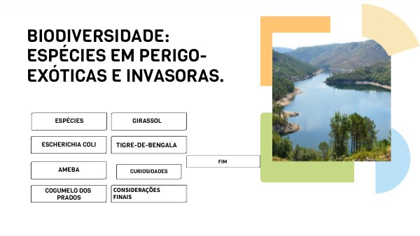 ESCHERICHIA COLIEscherichia coli é uma espécie do reino Monera, é um ser procarionte, vive no intestino humano e noutros animais de sangue quente e é um ser heterotrófico. Está bactéria ajud a na digestão e na produção de vitaminas no intestino, mas também pode causar doenças. Para evitar essas doenças é necessário lavar as mãos antes de tocar numa comida e depois de ir a casa de banho, mas também lavar os alimentos antes de os consumir. AMEBA A ameba tem ampla distribuição e não estão ameaçadas. São importantes para o equilíbrio ecológico, pois decompõem matéria orgânica e reciclam nutrientes. Normalmente não causam impacto negativo na biodiversidade , mantendo-se como parte natural dos ecossistemas. COGUMELO-DOS-PRADOS O Cogumelo-dos-prados (Agaricus campestris) é um fungo comum em Portugal, encontrado principalmente em prados, campos e pastagens. Desempenha um papel importante na reciclagem de nutrientes, ajudando a manter o equilíbrio do ecossistema. É comestível quando jovem, mas deve ser identificado com cuidado para evitar confusões com espécies tóxicas. A preservação do seu habitat é fundamental para garantir a continuidade da espécie e a saúde do meio ambiente. GIRASSOL O girassol (Helianthus annuus) apresenta um estado de conservação estável, sendo amplamente cultivado em diversas regiões do mundo. Apesar de não ser uma espécie ameaçada, a sua introdução em áreas fora do seu habitat natural pode ter efeitos sobre a biodiversidade local. Em determinadas circunstâncias, pode competir com espécies nativas por recursos como luz, solo e água, alterando o equilíbrio ecológico. No entanto, quando cultivado de forma controlada e em ambientes agrícolas, o impacto do girassol sobre a biodiversidade autóctone tende a ser reduzido. Assim, é importante promover práticas sustentáveis de cultivo que minimizem possíveis efeitos negativos sobre os ecossistemas nativos da região onde é introduzido. Tigre-de-bengala O tigre-de-bengala encontra-se em perigo de extinção, principalmente devido à perda de habitat, à caça furtiva e à redução das suas presas naturais. Sendo um predador de topo, o seu desaparecimento provoca desequilíbrios ecológicos, permitindo o aumento excessivo de herbívoros e, consequentemente, a degradação da vegetação.