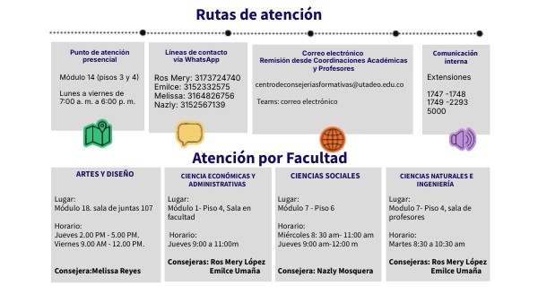 Lugar: Módulo 7 - Piso 6Horario: Miércoles 8: 30 am- 11:00 am Jueves 9:00 am-12:00 m Consejera: Nazly Mosquera