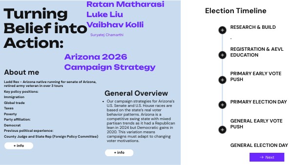 Voter decisions aren’t random, they follow predictable patterns that reveal why people vote the way they do. In Arizona, these patterns show the state’s diversity which includes young, tech-savvy students; working-class families; Native and Hispanic communities; and retired veterans. Each group responds to different motivations. Some look toward the future and change while others look back at leadership they trust. By understanding these patterns, our campaign can make targeted strategies that don’t just speak at voters, but speak to them. For example, younger people in Arizona often vote based on how candidates plan to shape the next decade of jobs and education, while older voters weigh proven records of service. Communities that feel underrepresented often respond when they see policies that reflect their lived experiences. These frameworks help guide everything from how we frame policies in speeches, to what messages appear on social media. They ensure our campaigns are rooted in understanding human behavior, not just political messaging.