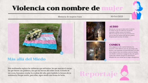 Este multimedia explora las violencias que enfrentan: las que marcan el cuerpo, las que hieren con palabras y las que las borran del relato social. A través de sus voces, buscamos revelar la crudeza del odio, pero también la ternura de su resistencia. Porque existir, para ellas, sigue siendo una forma de lucha.
