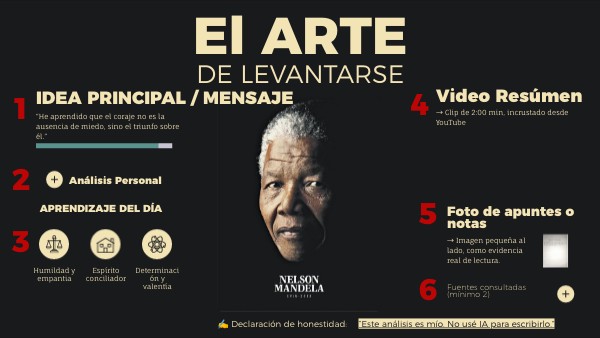 Para mí, Nelson Mandela fue una de las personalidades humanas más inspiradoras del siglo veinte. Aprendí que la verdadera fortaleza no consiste en imponer poder, sino en mantener la dignidad a pesar de las circunstancias difíciles, al conocer su historia. Mandela, en sus 27 años de encarcelamiento, no solo soportó el sufrimiento emocional y físico, sino que además desarrolló una mente pacífica, estratégica y con paciencia. Me enseñó que la libertad comienza en el interior de uno mismo, cuando se escoge no dejar que el odio dirija los pensamientos.