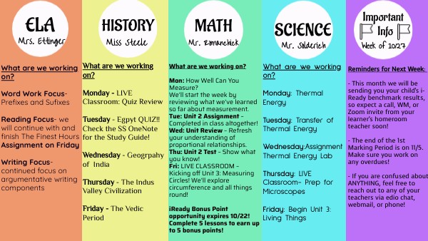 Reminders for Next Week: - The end of the 1st Marking Period is on 11/5. Make sure you work on any overdues! - 11/7 is the first FLEX DAY of the school year. Students need to log in for attendance and should use the day to get caught up on overdue assignments. - If you are confused about ANYTHING, feel free to reach out to any of your teachers via edio chat, webmail, or phone!