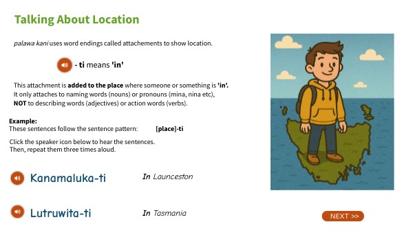 1. Go to the palawa kani Place Names Map2. Find your location & the language word for that place 3. Listen & repeat the place name three times aloud 4. Write a sentence using the sentence pattern: mina+[place]-ti (I am in___) 5. Write & voice record the sentence in your language library