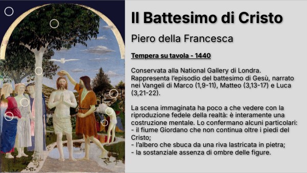 Tempera su tavola - 1440 Conservata alla National Gallery di Londra. Rappresenta l’episodio del battesimo di Gesù, narrato nei Vangeli di Marco (1,9-11), Matteo (3,13-17) e Luca (3,21-22). La scena immaginata ha poco a che vedere con la riproduzione fedele della realtà: è interamente una costruzione mentale. Lo confermano alcuni particolari: - il fiume Giordano che non continua oltre i piedi del Cristo; - l’albero che sbuca da una riva lastricata in pietra; - la sostanziale assenza di ombre delle figure.