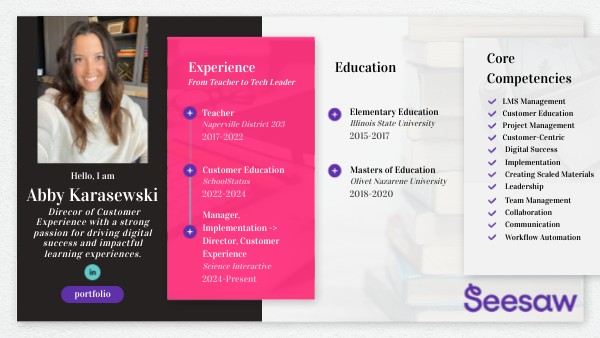 Throughout my career, I’ve worked in learning design across a variety of roles, blending education, technology, and user experience. As a teacher, I developed engaging, curriculum-aligned lessons that effectively supported student learning through evidence-based instructional methods. At SchoolStatus, I designed modular, self-paced courses and built a thriving user community within our LMS. Currently at Science Interactive, I’ve created a comprehensive onboarding and continuous learning program from the ground up, built and maintained our knowledge base, produced on-demand training videos, and implemented automations within our customer management system to improve efficiency and user experience.