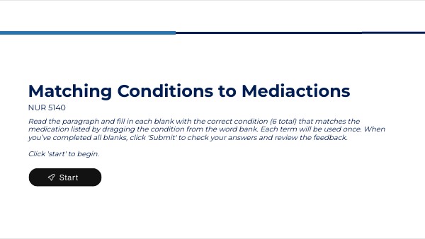 Read the paragraph and fill in each blank with the correct condition (6 total) that matches the medication listed by dragging the condition from the word bank. Each term will be used once. When you’ve completed all blanks, click 'Submit' to check your answers and review the feedback. Click 'start' to begin.