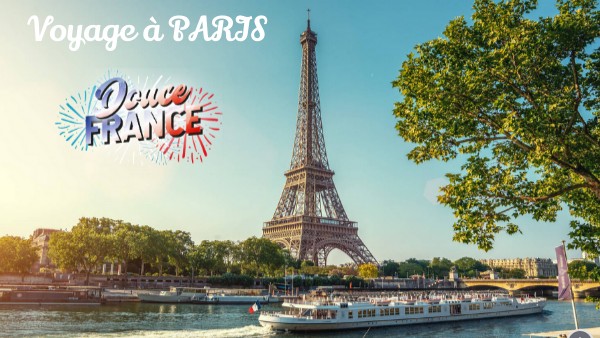 - Le bateau mouche - Les monuments de la capitale - La Philharmonie de Paris - La Cité des Sciences et de l'Industrie - L'Assemblée Nationale - Le jardin des Tuileries / La pyramide du Louvre - La Tour Eiffel
