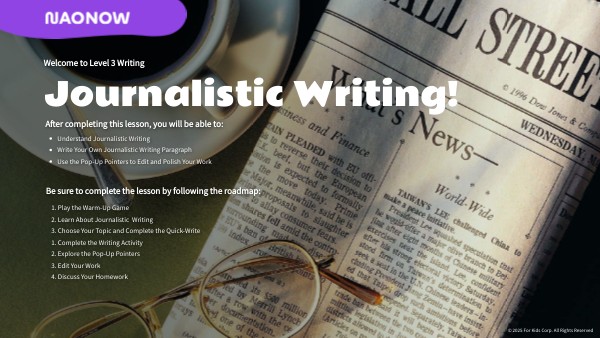 Journalistic writing is how we tell real or factual stories in a clear and interesting way. This type of writing answers questions about what happened, where, when, why, who was involved, and how it happened. Reporters write news articles to inform or explain real events. Good journalists share facts!
