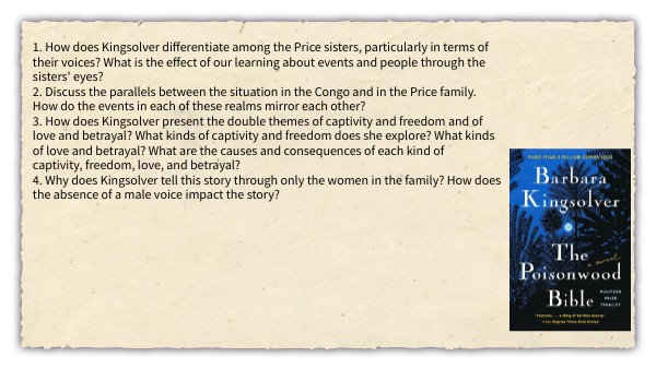 1. How does Kingsolver differentiate among the Price sisters, particularly in terms of their voices? What is the effect of our learning about events and people through the sisters' eyes? 2. Discuss the parallels between the situation in the Congo and in the Price family. How do the events in each of these realms mirror each other? 3. How does Kingsolver present the double themes of captivity and freedom and of love and betrayal? What kinds of captivity and freedom does she explore? What kinds of love and betrayal? What are the causes and consequences of each kind of captivity, freedom, love, and betrayal? 4. Why does Kingsolver tell this story through only the women in the family? How does the absence of a male voice impact the story?