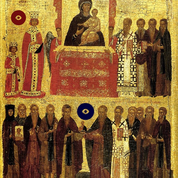 This piece is the Icon of the Triumph of Orthodoxy. This piece was made using egg tempera with gold leaf on a wood panel. The context of this image is that it marks the end of Iconoclasm in the Byzantine Empire. This means that the representation of Gods and Goddesses are now being represented by human figures rather than symbols. Before the end of Iconoclasm, people thought that worshiping images and pictures would get them punished by the Gods. This piece shows Theodora and her son Micheal III. The hierarchy of scale shows them as being very important. The saints at the bottom are holding holy icons which also represents the end of iconoclasm. Copies of this image are in existence to spread the news of the end of iconoclasm and propaganda of the new ruler Theodora and her son Micheal.