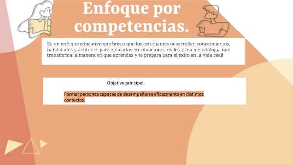 • Aprendizaje enfocado en lo que el estudiante puede hacer. • Promueve la autonomía y responsabilidad del alumno. • El docente actúa como guía o facilitador, no solo como transmisor de información.